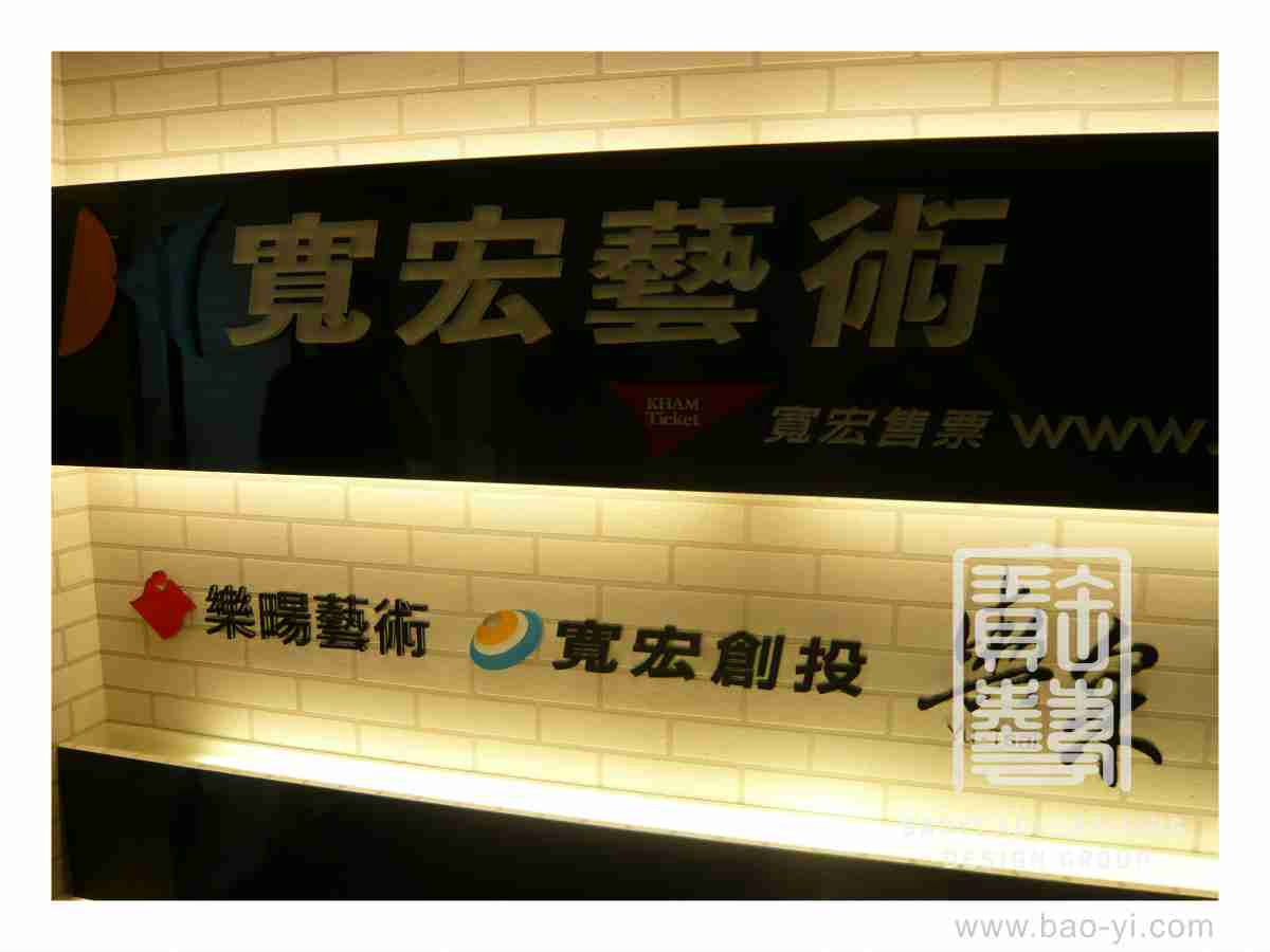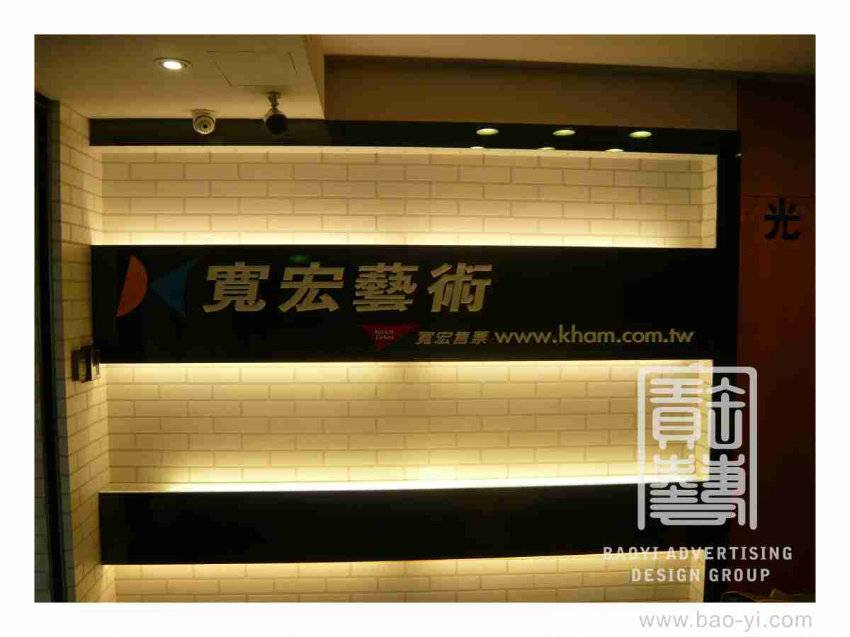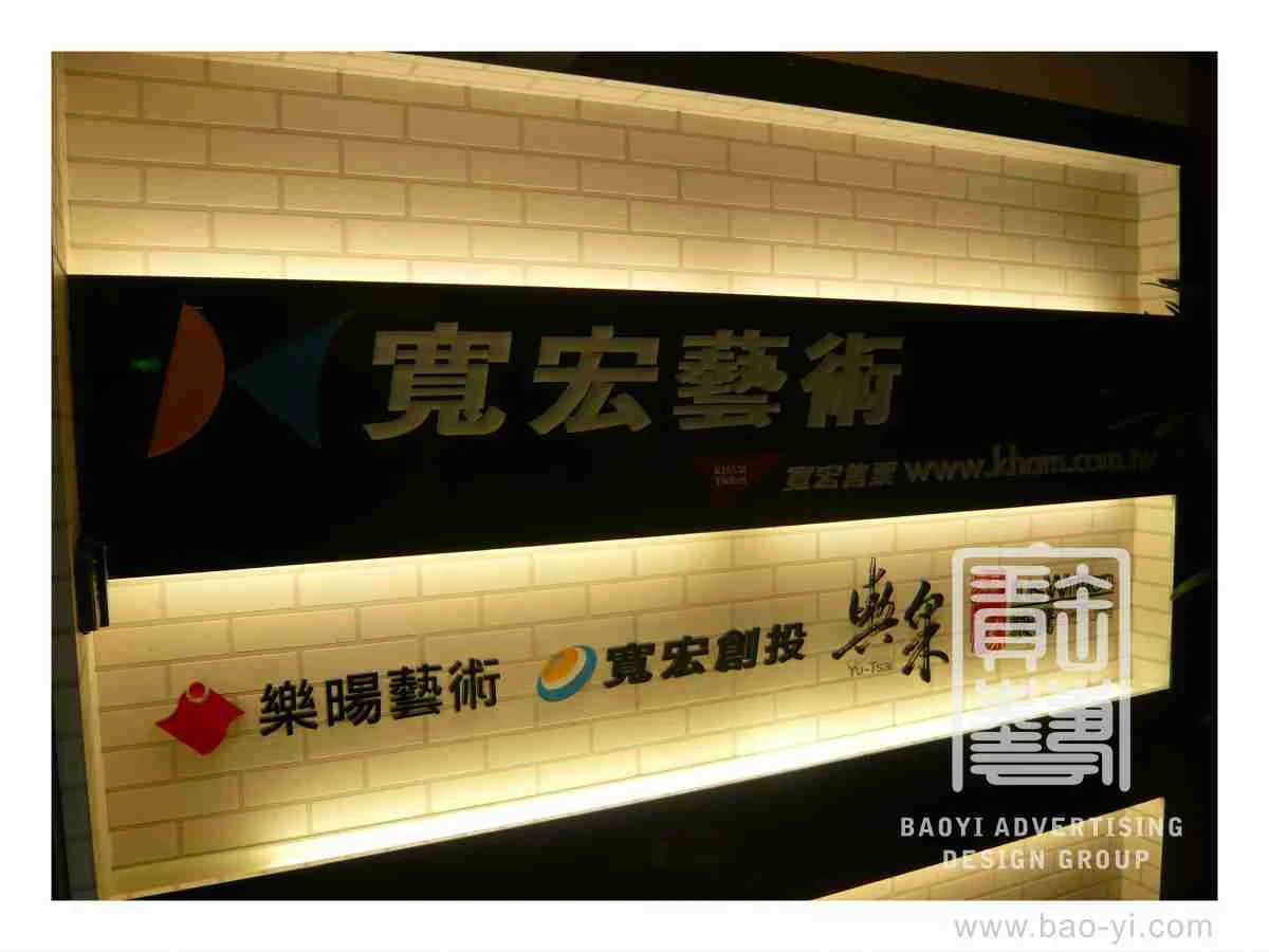 招牌-室內形象招牌設計-寬宏藝術,位於民生東路2段170號,很感謝寬宏藝術的王小姐,對本公司的支持和信任,我們以水晶字為主,來增加牆面立體感,牆面背景的顏色,結合雙層烤漆水晶字,並採取專業pantone調色,而室內招牌顏色的選用,呈現對比色,和背景色互相映襯,在利用燈光使招牌完美的達到專業的企業形象效果。這樣的設計效果您喜歡嗎?